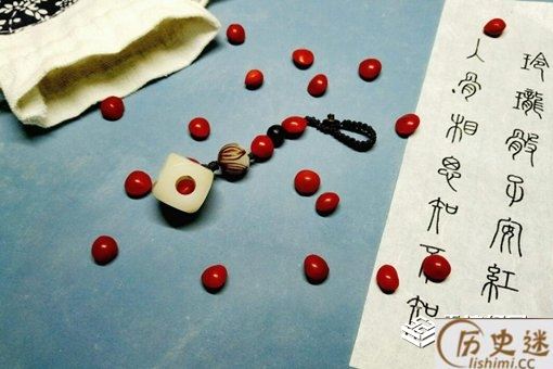 红豆即相思子,古人常用以象征爱情或相思。王维《相思》诗云:“红豆生南国,春来发几枝?愿君多采撷,此物最相思。”唐朝时贵族的闺阁间流行一种玩物,拿一小块象牙剖成两面,镂空了镶入一颗红豆,再将剖开的两面嵌上去,复成六面,骰点当然亦是凿空的,一掷出去,六面皆红,即所谓“玲珑骰子安红豆”了。