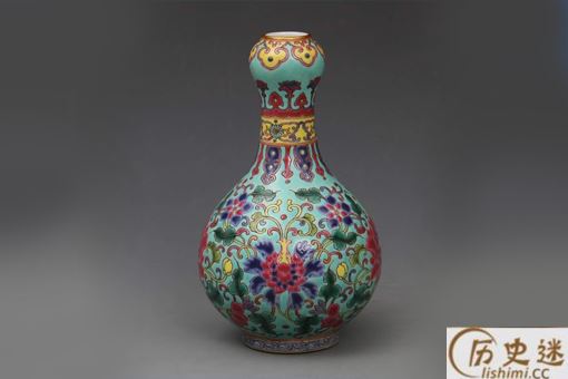 鉴赏鉴定:瓶口呈蒜头状,长颈,溜肩,硕腹,圈足。瓶内壁及圈足内施绿釉。通体以金彩绘锦纹为地,其上以珐琅彩绘各式缠枝花卉,色彩艳丽。口、足、颈部饰以多道金彩,愈显金碧辉煌,华贵典雅。外底双方框内书蓝料彩篆书“乾隆年制”印章款。