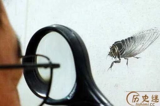 第二点,薄如蝉翼。专家建议,最好在放大镜下一探究竟。蝉的生命力,就体现在那一层透明的蝉翼之上,所以若想画好一只蝉,蝉翼的细节必须处理妥当,齐白石做到了。放大镜下,细小爪子的触须分叉,头部触角的真实刻画,自都不必多言,我们重点来看两扇互相重叠却又层次分明的蝉翼。