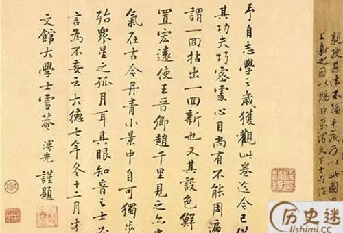 跋文记录了宋徽宗赵佶将图卷赏赐蔡京的日期,画家的名字、年龄、履历及其进献画作的经过和徽宗的褒奖之词,唯独没有道明画家姓氏及作品的题目。