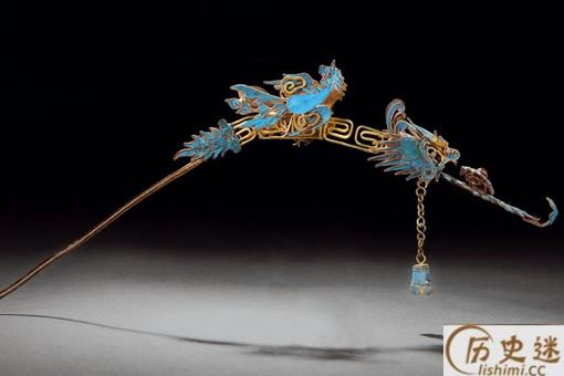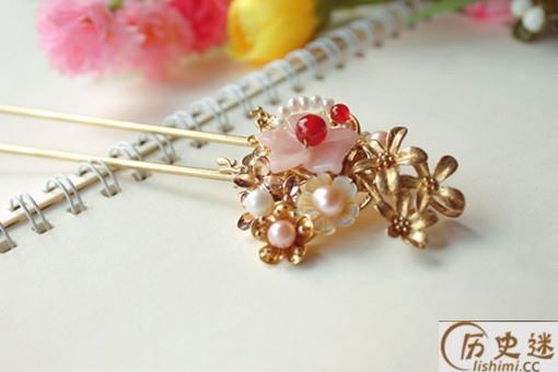 钗为珠翠和金银合制成花朵或其他造型的发钿,连缀着固定发髻的双股或多股长针,使用时安插在双鬓。